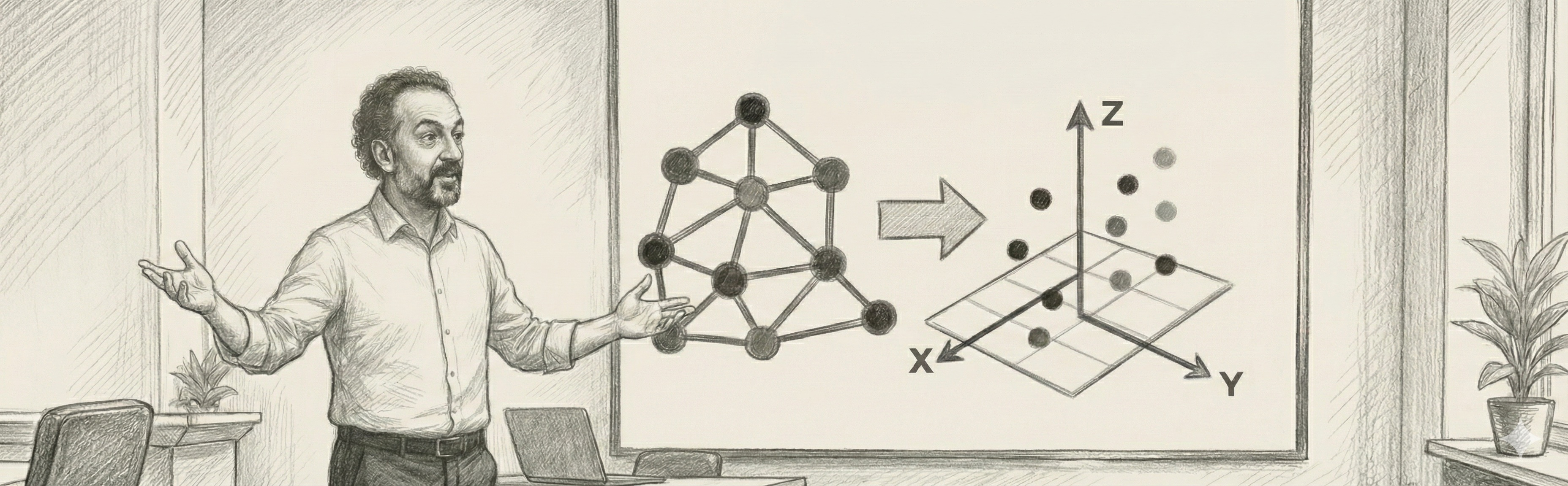 — the first step from the graph structure of English WordNet into geometric space, where meaning could now be expressed as a distance function.