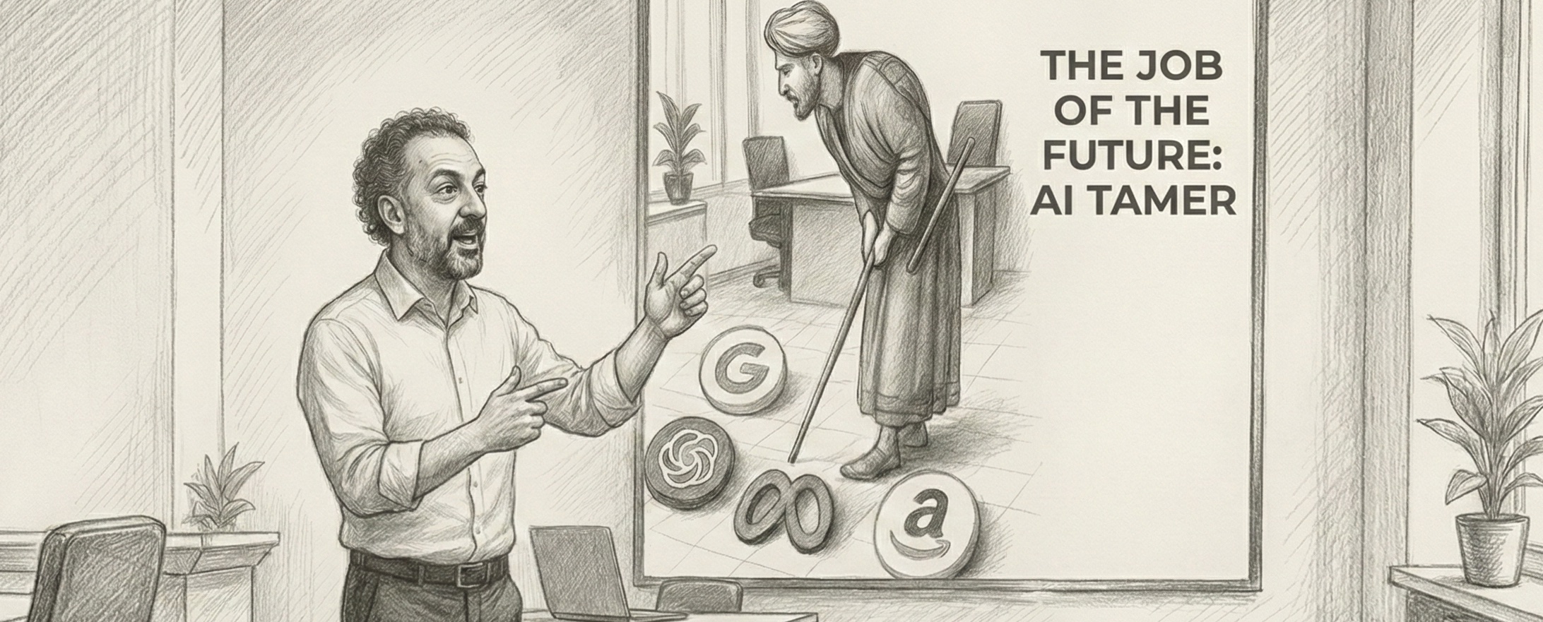 Yes, it is Osman Hamdi Bey’s famous “The Tortoise Trainer.” However, as you know, new AI tools can reinterpret images in a “hybrid” way, merging them with other elements. I designed this cover specifically to illustrate this situation and prevent misunderstandings. I changed the tortoises at the bottom, replacing them with the logos of well-known AI giants. I also added an office environment to the background. You might notice that there seems to be a hidden stick in the trainer’s pocket; we can probably call that an AI error, or a “hallucination.”
